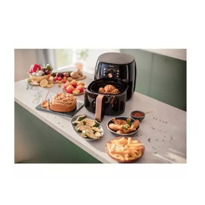 Giảm lượng chất béo đến 90%, thực phẩm chín đều mà không cần trở mặt với công suất 2200W, quạt đối lưu và công nghệ Rapid Air. Nhờ quạt đối lưu cùng công nghệ Rapid Air hiện đại, luồng khí trong nồi di chuyển nhanh gấp 7 lần thông thường và luân chuyển đều khắp nồi, giúp thực phẩm chín đều mà không cần trở trong suốt quá trình nấu. Thời gian nấu nướng nhờ thế cũng sẽ được tiết kiệm đáng kể. Với các thực phẩm khoảng 1.4 kg trở xuống, nồi sẽ nấu nhanh hơn 1.5 lần so với lò nướng thông thường, nhờ luồng khí di chuyển nhanh hơn trong không gian nhỏ hơn so với lò nướng. Đặc biệt, thực phẩm chế biến từ nồi chiên không dầu có lượng chất béo giảm đến 90%, đảm bảo sức khỏe cho bạn và cả gia đình.